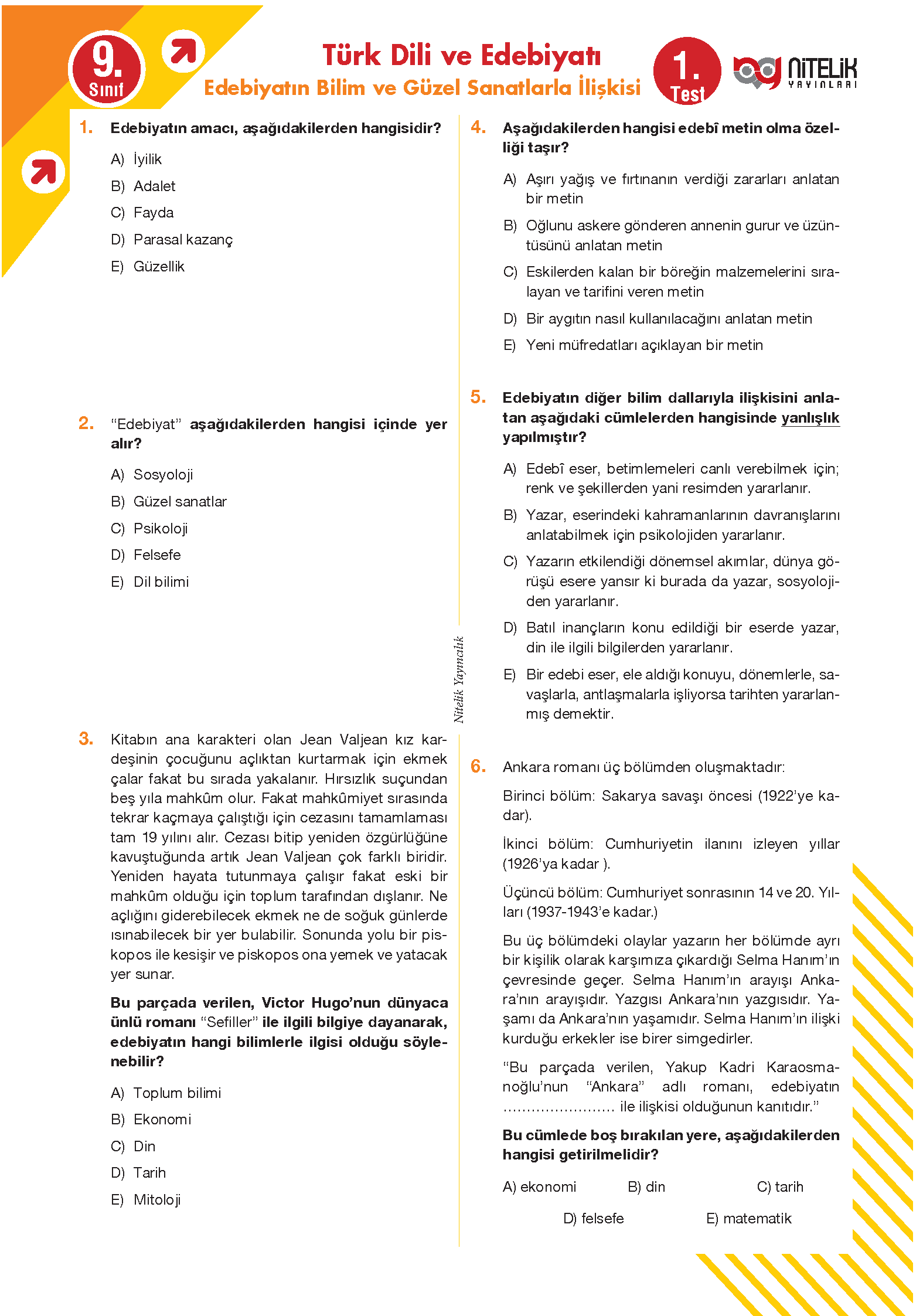 9. Sınıf Türk Dili ve Edebiyatı Yaprak Test