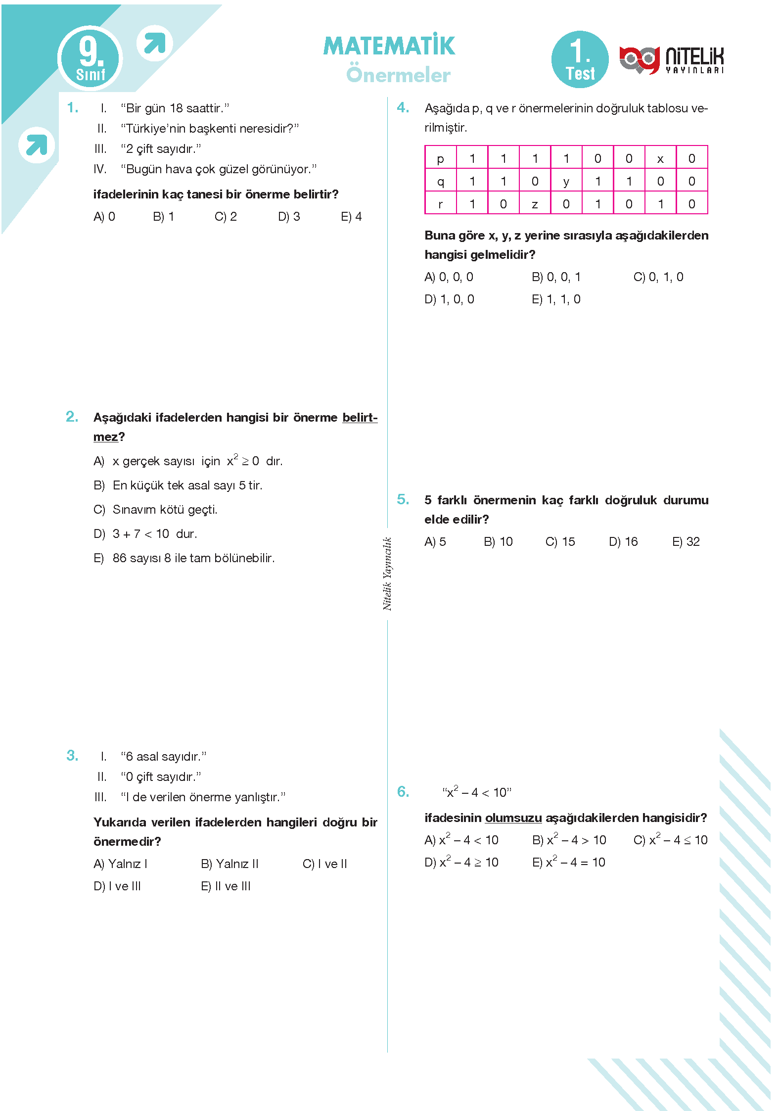 9. Sınıf Matematik Yaprak Test